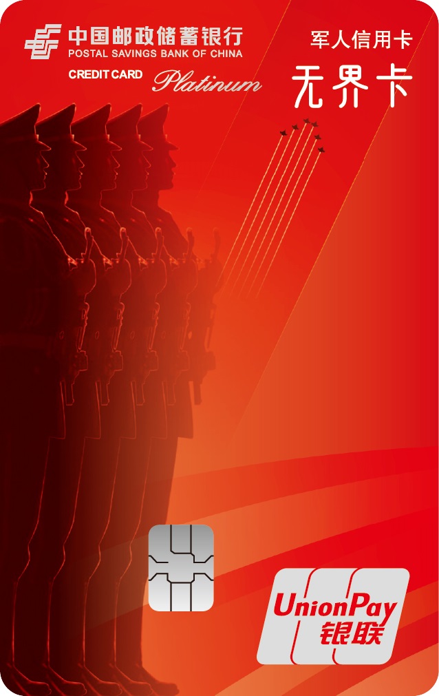 中国邮政储蓄银行军人主题无界卡(以下简称“军人主题卡”)是总行面向军人、军人家属发行的主题信用卡产品。该产品具备我行同等级金卡、白金卡IC信用卡的基本金融功能和服务。持卡人还可享受由银联提供的无界卡专属权益。权益按季度进行更新。