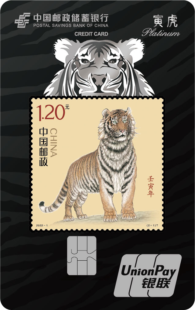 壬寅年生肖卡卡面以《壬寅年》生肖邮票“国运昌隆”为主题,邮票图案由著名艺术家冯大中大师设计。猛虎上山,矗立远眺,气宇轩昂、志存高远,传达出国家蒸蒸日上、雄心壮志的含义。同时卡面采用浮雕、烫印等工艺凸显邮票轮廓,结合矢量插画的抽象手法设计出老虎脸部形象,时尚大气。