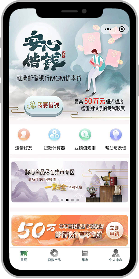 北京分行“邮储安心借”小程序以消费贷款申请为主要流程,配套开发了“额度测算”、“贷款计算器”等便捷的应用功能,系统可根据用户自身特点智能推荐适合的贷款产品,精准展示每月还款计划,让用户感受到数字化背景下的全新体验模式。