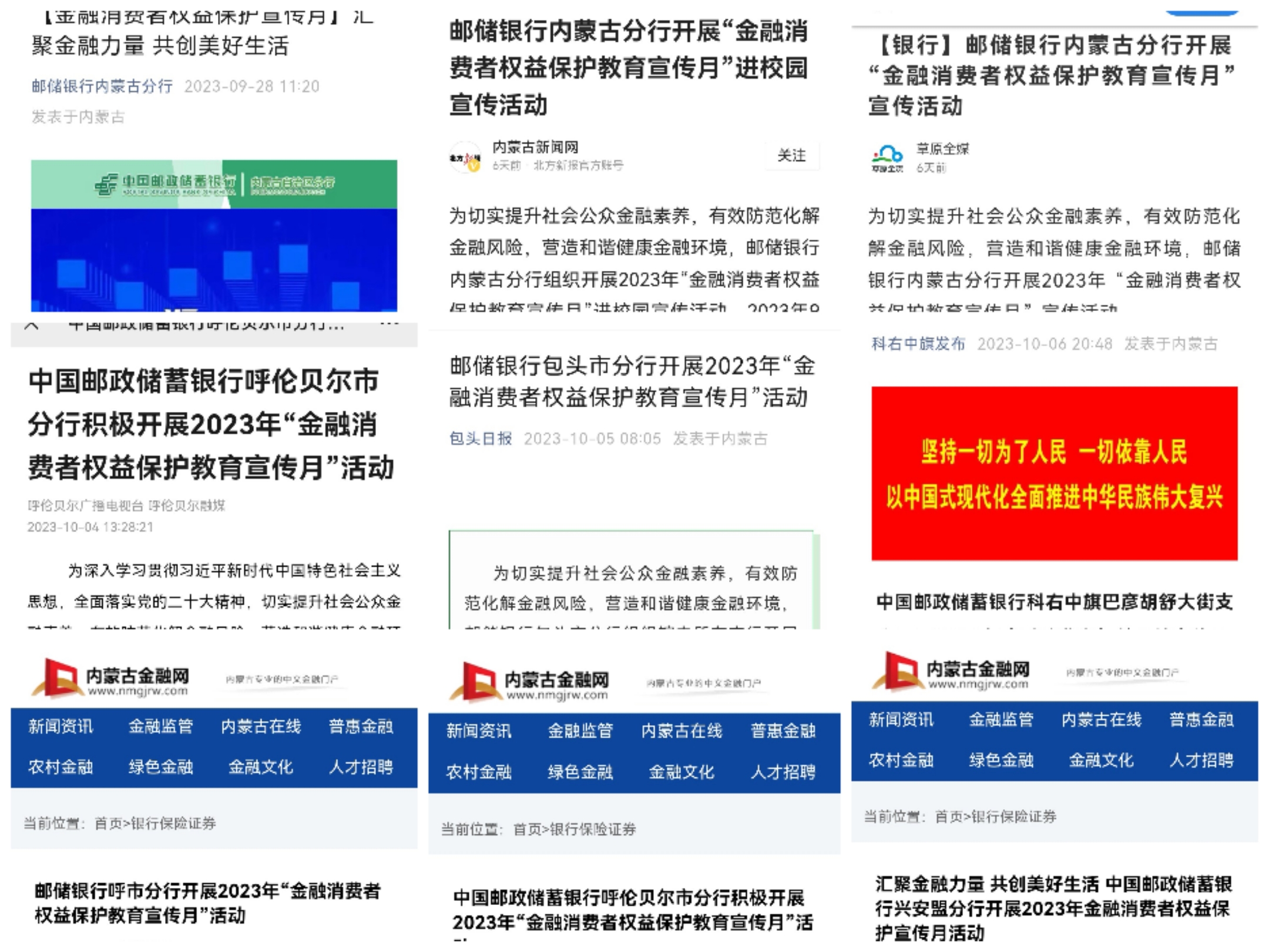 邮储银行内蒙古分行通过邮储银行内蒙古分行、邮储银行鄂尔多斯分行、邮储银行包头市分行公众号发布金融知识推文,组织全行员工转发金融监管总局发布的行业宣传视频。邮储银行内蒙古分行及辖内各盟市分行通过草原全媒、内蒙古新闻网、鄂尔多斯新闻网、乌兰察布云、呼伦贝尔融媒、包头日报、通达融媒、网易财经网、锡林郭勒新闻、科右中旗发布、金融消费内蒙古、呼和浩特日报、内蒙古金融网、赤峰日报、内蒙古晨报等媒体发布各类宣传信息,全面扩大宣传影响力及覆盖面。