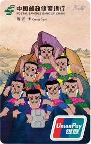 金卡异形卡面以活泼灵动的四娃(火娃)形象为主体设计,根据四娃的本领特点,采用红色火云纹为底色,以葫芦形状为卡面外形,造型别致,趣味横生,同时卡面增加了金葱粉效果,使卡面光彩夺目,熠熠生辉,更添质感。葫芦与“福禄”谐音,传达出我行对持卡人拥有幸福生活、美满事业的美好祝愿。