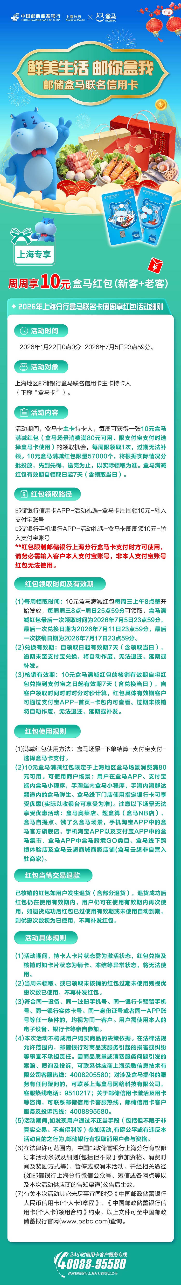 “马”上领红包!上海盒马周周送10元!