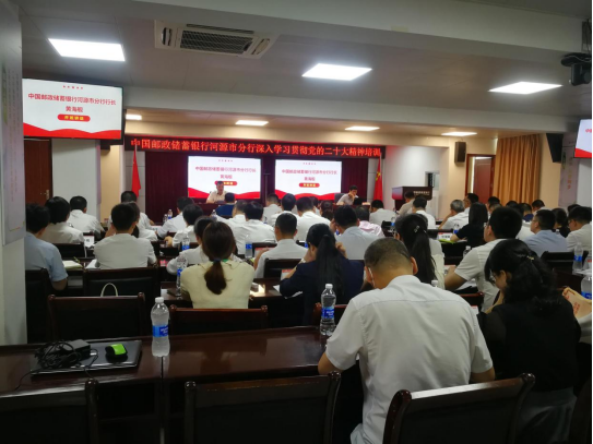 为深入学习贯彻党的二十大精神,准确把握其丰富内涵和精神实质,把党的二十大精神转化为指导实践、推动工作的强大力量,把党的创新理论贯彻到工作各方面、全过程,更好地推进邮储银行河源市分行高质量发展,根据《中共中央关于认真学习宣传贯彻党的二十大精神的决定》,按照邮政集团公司党组、邮储银行总行、省分行党委相关工作要求,邮储银行河源市分行党委专门研究制定了学习贯彻党的二十大精神工作方案,并于5月25日到27日组织该行中层及以上党员领导干部及全体党员进行了为期3天的集中培训,为保证这次培训班的效果,该分行专门邀请了广州市委党校及中山大学的教授授课。