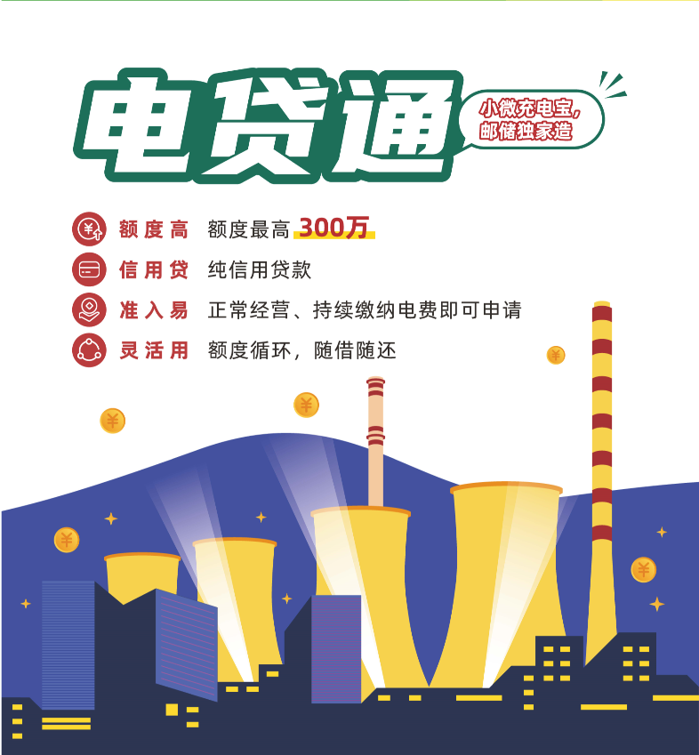 广东小企业电贷通业务,是指面向由我行认可且连续正常缴纳电费的中小微企业法人,依据其近一年缴纳电费总额发放的短期流动资金贷款业务。额度循环、最高300万,纯信用贷款,随借随还。小微充电宝,邮储独家造!