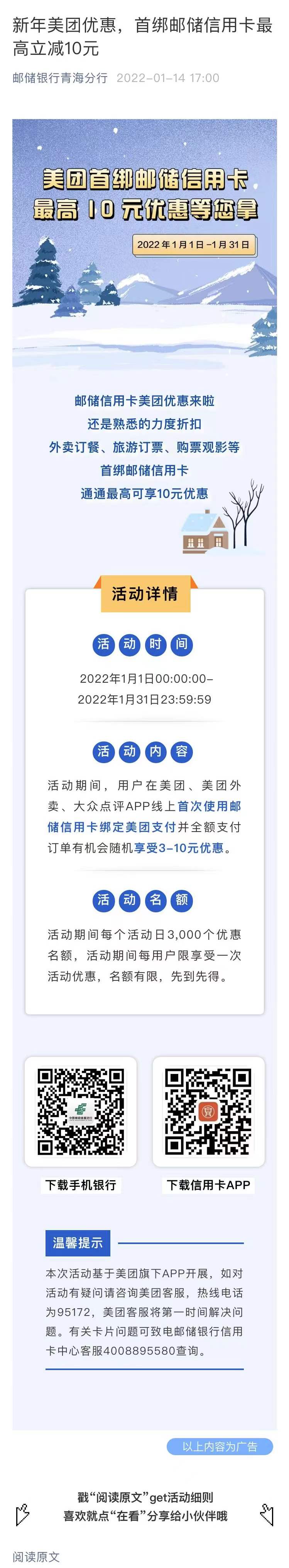 新年美团优惠,首绑邮储信用卡最高立减10元