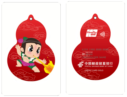 金卡异形卡面以活泼灵动的四娃(火娃)形象为主体设计,根据四娃的本领特点,采用红色火云纹为底色,以葫芦形状为卡面外形,造型别致,趣味横生,同时卡面增加了金葱粉效果,使卡面光彩夺目,熠熠生辉,更添质感。葫芦与“福禄”谐音,传达出我行对持卡人拥有幸福生活、美满事业的美好祝愿。