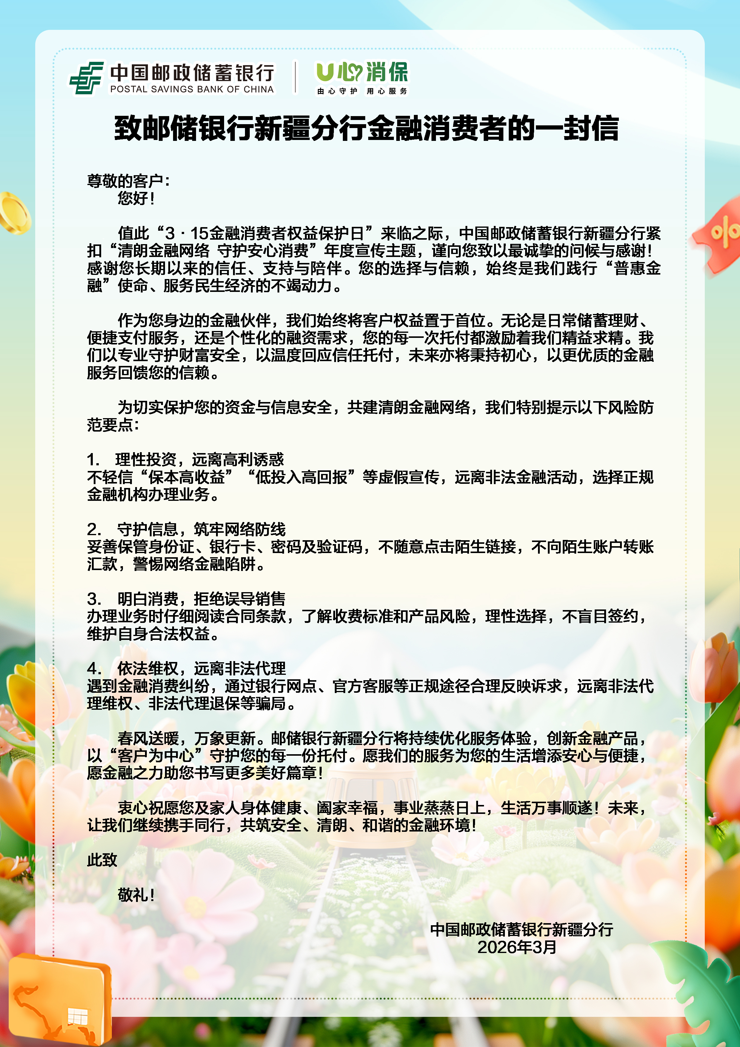 致邮储银行新疆分行金融消费者的一封信