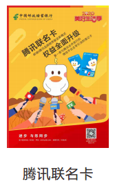 中国邮政储蓄银行腾讯联名卡是以吉祥物“充鸭”形象为主,在卡片设计中引入LED工艺,线下支付时“充鸭”头顶LED光源点亮的借记卡。腾讯联名卡可提供中国邮政储蓄银行标准绿卡通IC卡全部金融服务功能,还可享免收卡工本费、小额账户管理费、借记卡年费,开卡激活和用卡还可同时享受系列权益。