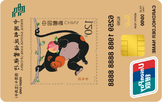 丙申年生肖卡是我行首款以生肖贺岁邮票为主题的信用卡,卡面图案以《丙申年》猴票为主题,采用第四轮“灵猴献寿”的邮票,由我国第一枚猴票设计者、美术界泰斗黄永玉先生设计,灵猴攀爬树枝手托寿桃,笑容可掬,生动活泼。灵猴攀枝托桃,寓意猴年蒸蒸日上、福寿吉祥,传递新春贺喜的美好祝愿。