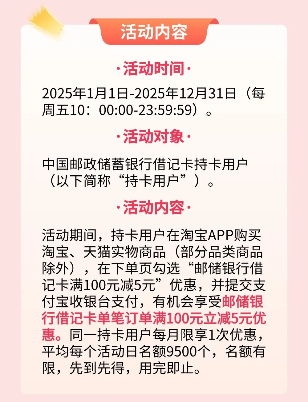 13、在法律法规许可的范围内,邮储银行及淘宝天猫保留变更、调整、终止本活动之权利(包括但不限于延迟或提前终止本活动等),同时保留变更、调整本活动条款和细则的权利,邮储银行官方网站(www.psbc.com)公告后生效。