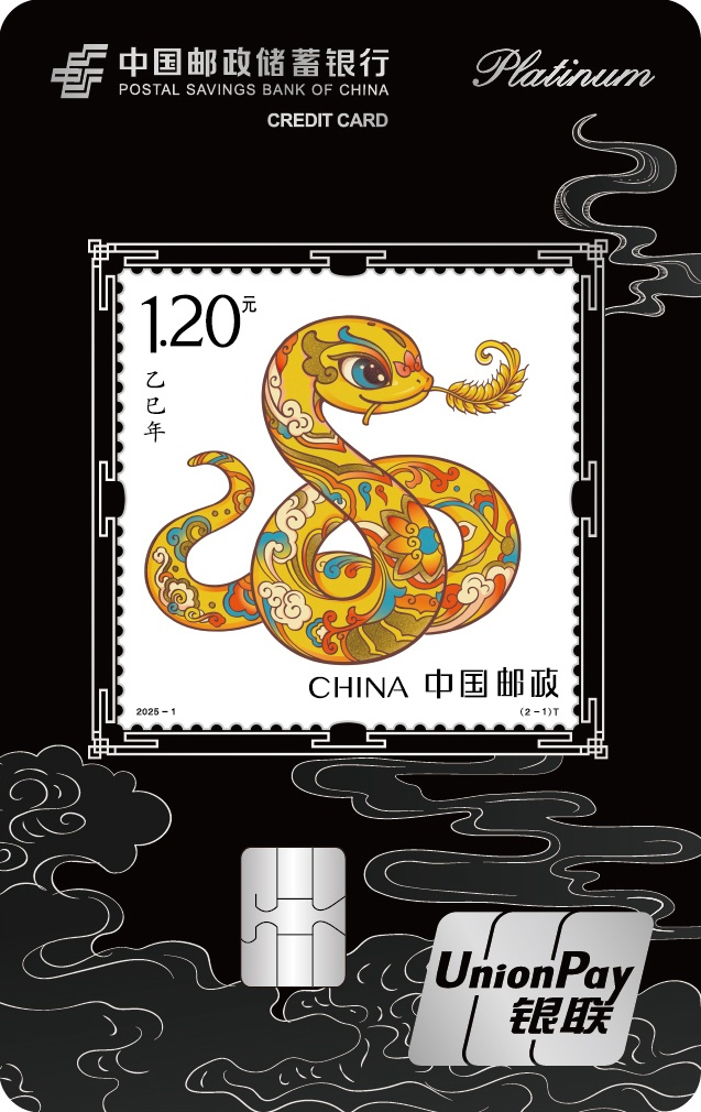 乙巳年生肖卡卡面以《乙巳年》生肖邮票“蛇呈丰稔”为主题,提炼了中华传统文化中盘蛇的灵动意象,辅以敦煌祥云元素和喜庆装饰,应和年节氛围。金色的蛇躯蜿蜒,口中衔着一束“嘉禾”,象征着“仓廪实,衣食足”的美好图景。既体现了生肖文化的独特魅力,又凝聚了朴素灵活的民间智慧。