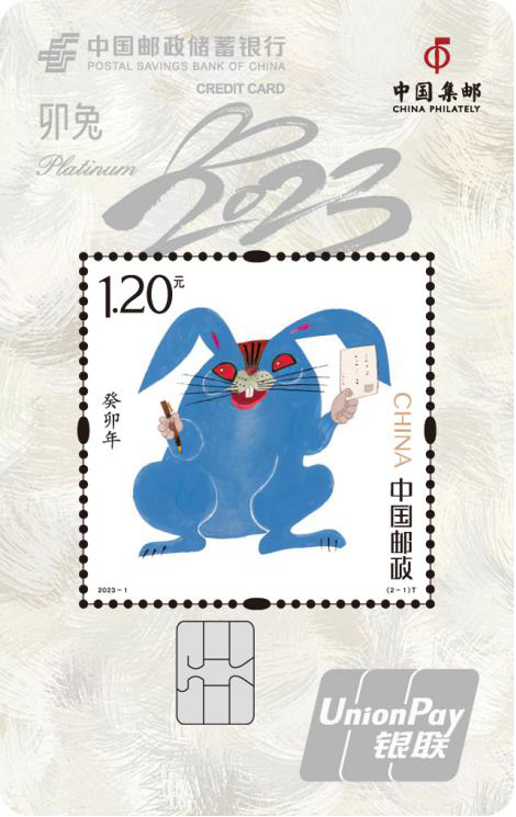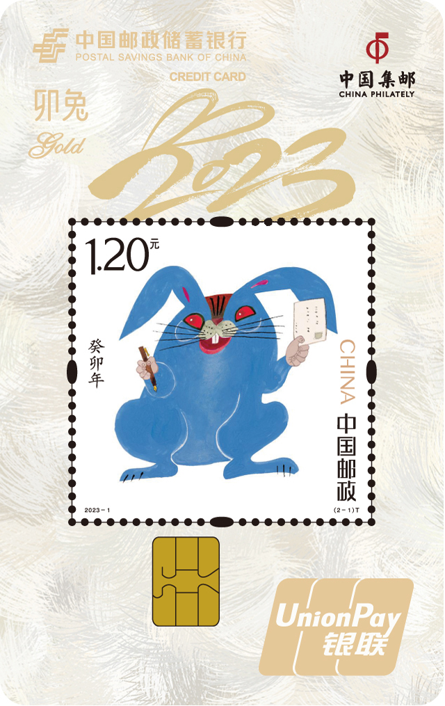 癸卯年生肖卡卡面以《癸卯年》生肖邮票“癸卯寄福”为主题,邮票图案由著名艺术家黄永玉大师设计。用别出心裁的蓝色描绘了一只右手执笔、左手持信的睿智卯兔,仿佛在向人们传递着新春的美好祝福。