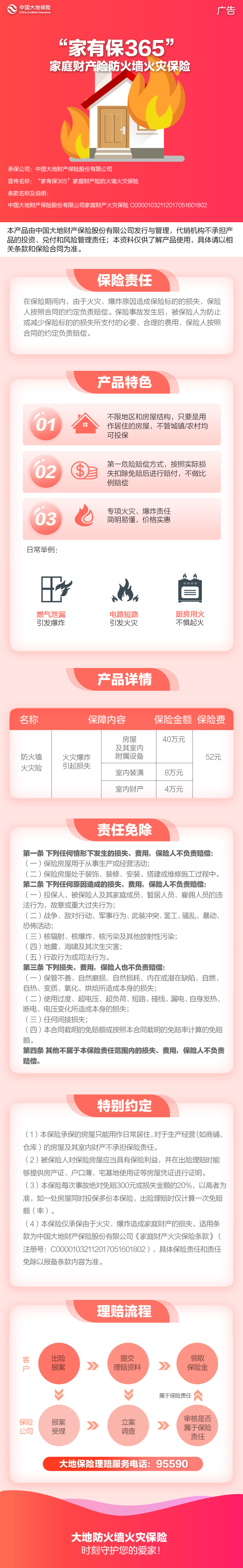 大地财险“家有保365”家庭财产防火墙火灾保险