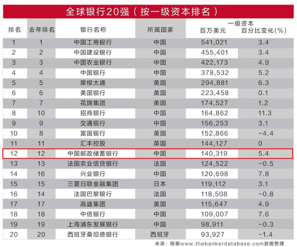7月2日,英国《银行家》杂志(The Banker)发布了“2025年全球银行1000强”榜单,中国邮政储蓄银行以2024年末一级资本1403.19亿美元连续三年位列第12位,连续五年进入全球20强。