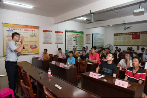 同时,他们还会邀请种桑养蚕专家定期为村民们讲课,鼓励他们种桑养蚕,改善家庭收入结构。图为湾岭镇种桑养蚕专家陈世锦在夜校将桑蚕养殖技术。