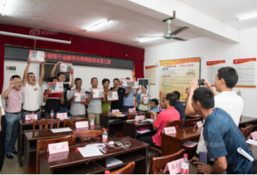 夜校的课程经常安排有奖知识问答,村民参与学习的积极性非常高。8月26日,一堂金融课程结束后,获奖村民上台合影,展示他们的奖品。