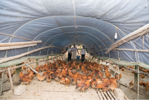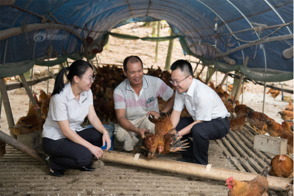 黎和光和他的联保户信誉非常好,总是在还款周期内将本息还清。邮储银行工作人员每年都会上门拜访,帮他制定贷款方案。除了提供金融服务外,还会帮忙提供一些市场信息,这些年,邮储银行陆续帮助黎和光找到优质饲料生产商、屠宰场、餐饮企业等合作对象。几年光景,村里的养殖户已把邮储银行的工作人员当成了亲人。图为邮储银行海南省琼中县支行副行长陈泽捷、信贷员杨雪玲走访黎和光的养鸡场。