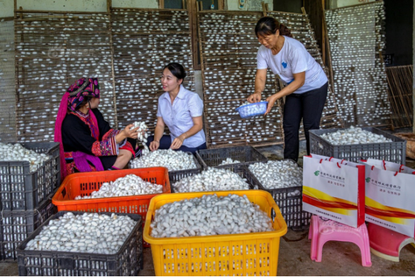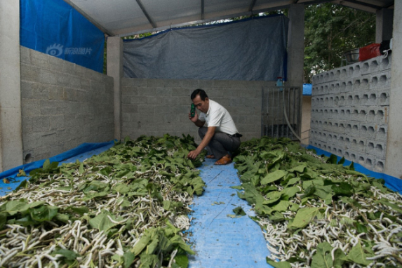 吴清高说,金融夜校教会了他和村民很多东西,更多的村民开始贷款修建蚕房,种桑养蚕。他自己的种桑养蚕技术也在夜校老师的指导下越来越好,越干越轻松,日子也越过越有奔头。图为吴清高家养的蚕大丰收。