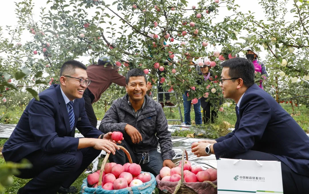 邮储银行甘肃省庆阳市分行信贷客户经理在苹果种植大户的苹果园进行贷后回访,与客户分享丰收的喜悦。