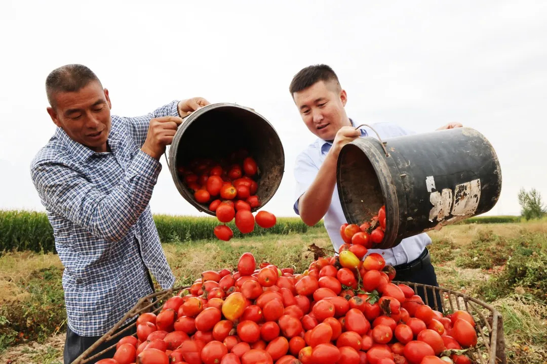 信用户村民正在农田里忙碌地收番茄,邮储银行内蒙古巴彦淖尔市分行营业部信贷客户经理送金融服务到田间地头。