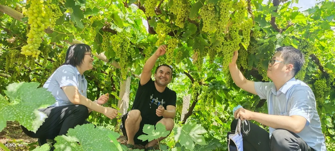 邮储银行新疆吐鲁番市分行助力农民发展葡萄种植,增产增收。图为信贷客户经理进行贷后回访。