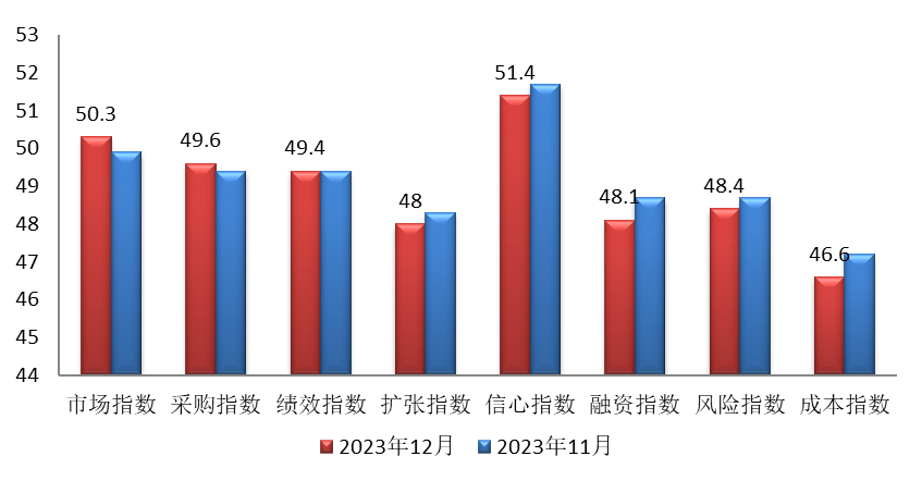 本月各分项指标指数两升一平五降(见图2)。市场指数为50.3,上升0.4个点;采购指数为49.6,上升0.2个点;绩效指数为49.4,与前月持平;扩张指数为48,下降0.3个点;信心指数为51.4,下降0.3个点;融资指数为48.1,下降0.6个点;风险指数为48.4,下降0.3个点;成本指数为46.6,下降0.6个点。