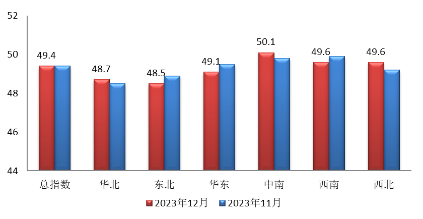 六大区域指数三升三降(见图3)。华北地区小微企业运行指数为48.7,上升0.2个点;东北地区小微企业运行指数为48.5,下降0.4个点;华东地区小微企业运行指数为49.1,下降0.4个点;中南地区小微企业运行指数为50.1,上升0.3个点;西南地区小微企业运行指数为49.6,下降0.3个点;西北地区小微企业运行指数为49.6,上升0.4个点。